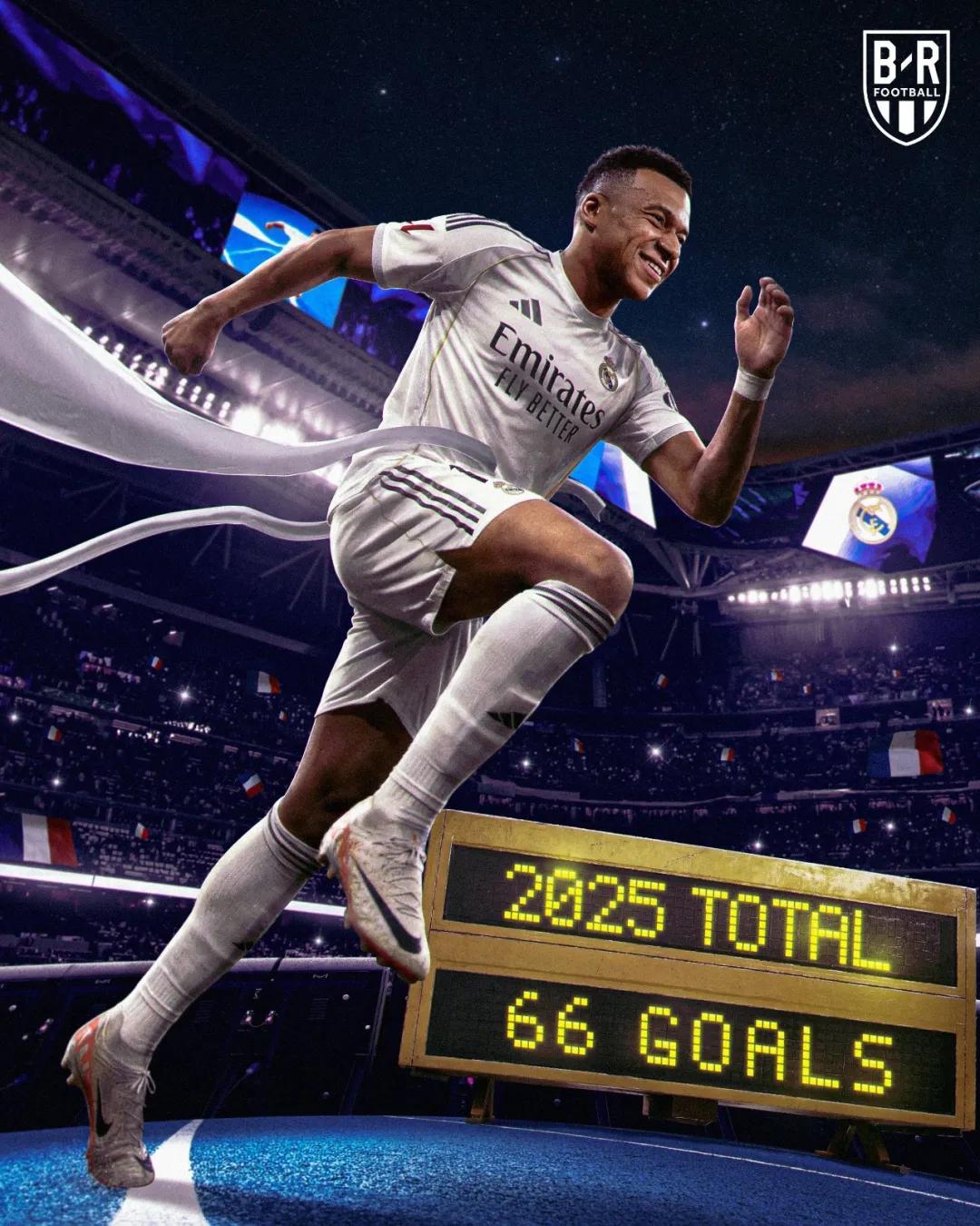 Besides matching Ronaldo’s Real Madrid single-year goal record, Mbappé also set a personal annual scoring record. In 2025, he scored 59 goals in 59 matches for Real Madrid, a new club record for goals in a calendar year. Including 7 goals for the national team, Mbappé scored 66 goals in 66 games this year, leading Kane by 7 goals and Haaland by 9. Although both have one match left in 2025, surpassing Mbappé will be very difficult.