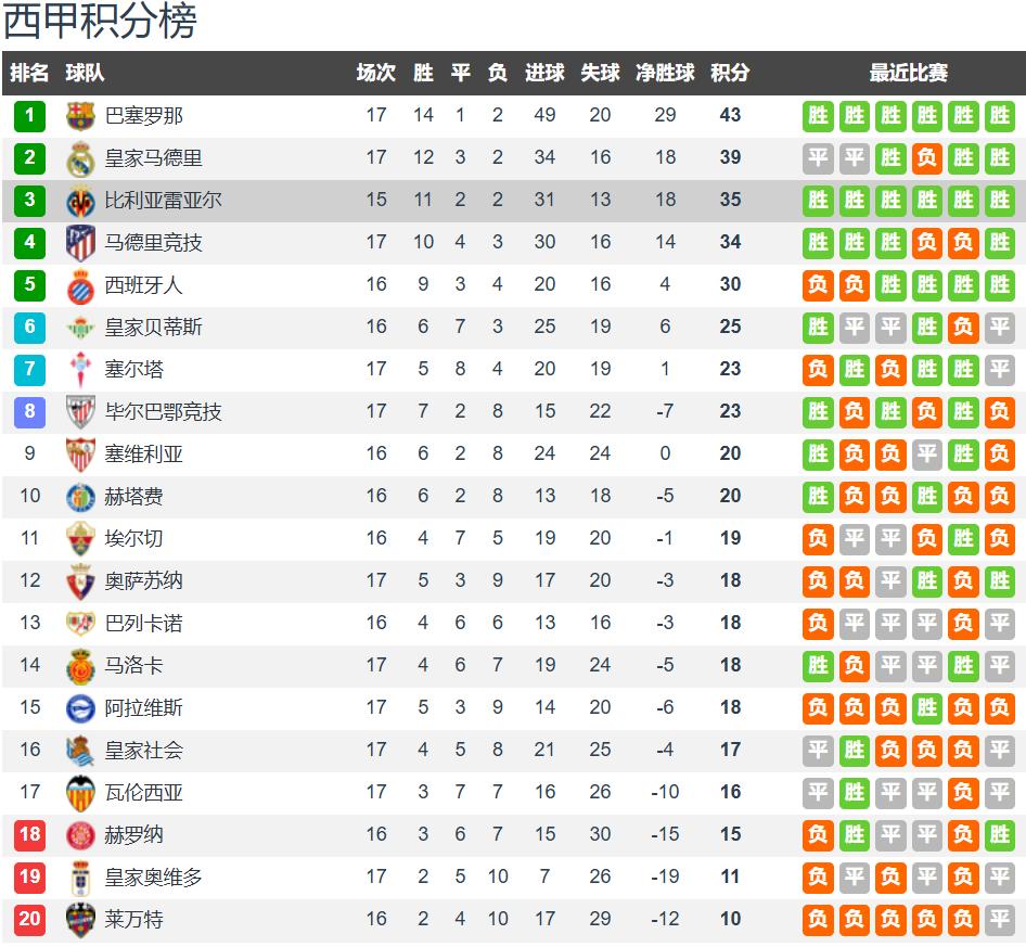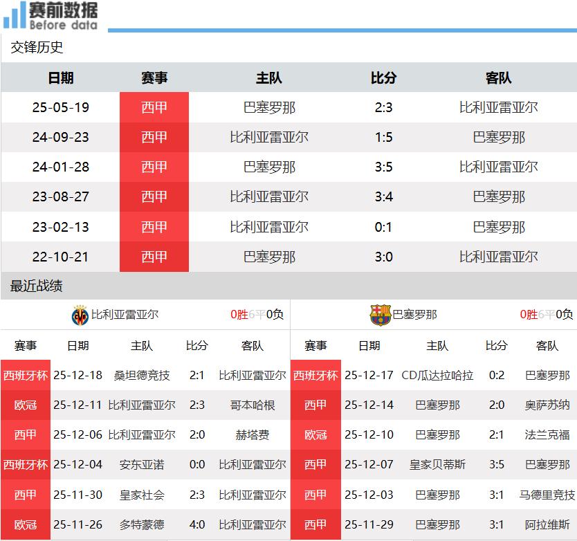 First:Team situationsAfter 16 rounds in La Liga, Villarreal stands third with 11 wins, 2 draws, and 2 losses, totaling 35 points; Barcelona ranks first with 14 wins, 1 draw, and 2 losses, accumulating 43 points. In the last La Liga round, Villarreal won 2-0 at home against Getafe, achieving six consecutive league victories, but was eliminated 1-2 away by Santander Athletic in the midweek Copa del Rey; Barcelona defeated Osasuna 2-0 at home, marking their seventh straight league win, and advanced in the Copa del Rey with a 2-0 away victory over CD Guadalajara.