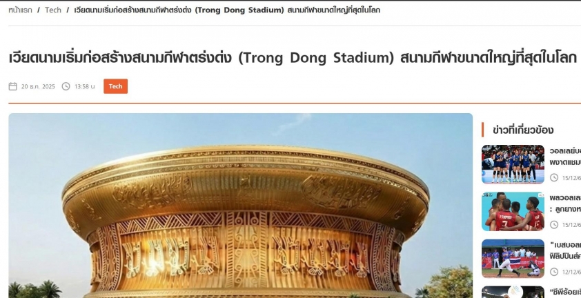 Upon news that Vietnam is about to own the world's largest stadium, Thai media immediately responded with clear admiration. The TNN Tech website stated verbatim: