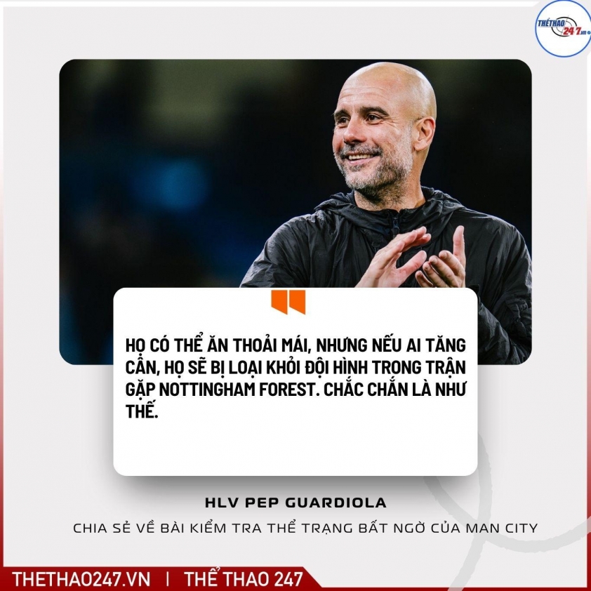 Pep Guardiola said: "As soon as they come back after three days off, I want to see how they return. They can eat, but I want to monitor them. I have to select the squad for the game against Nottingham Forest. Imagine a player who was in perfect shape but comes back three kilos heavier? He will stay in Manchester. He will not play, that’s for sure."- Pep Guardiola confirmed.