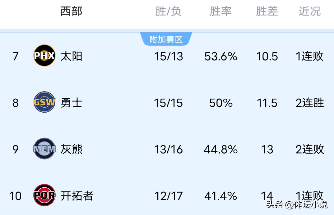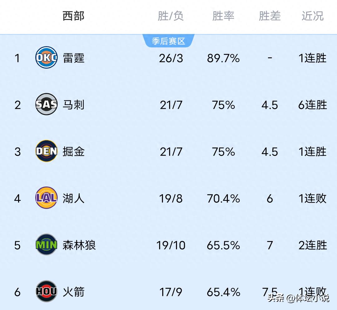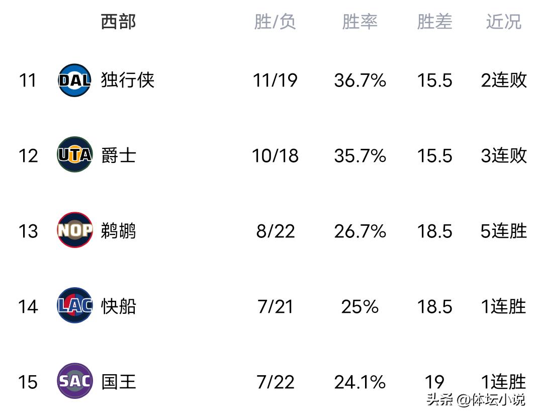 On December 24th Beijing time, the NBA regular season continued with multiple games finishing yesterday. The Mavericks faltered in the last quarter, losing 113-119 to the Pelicans; the Jazz were soundly beaten 112-135 by the Nuggets, who had four players scoring over 20 points; the Grizzlies lost 103-119 to the reigning champions Thunder; the Magic were crushed 97-120 by the Warriors; and the Pistons edged out the Trail Blazers, missing Yang Hansen, 110-102. With these results, the latest Western Conference standings are out: Thunder first, Nuggets third, Warriors eighth, Grizzlies ninth, Trail Blazers tenth, and the Pelicans, riding a five-game winning streak, climbed to 13th place!