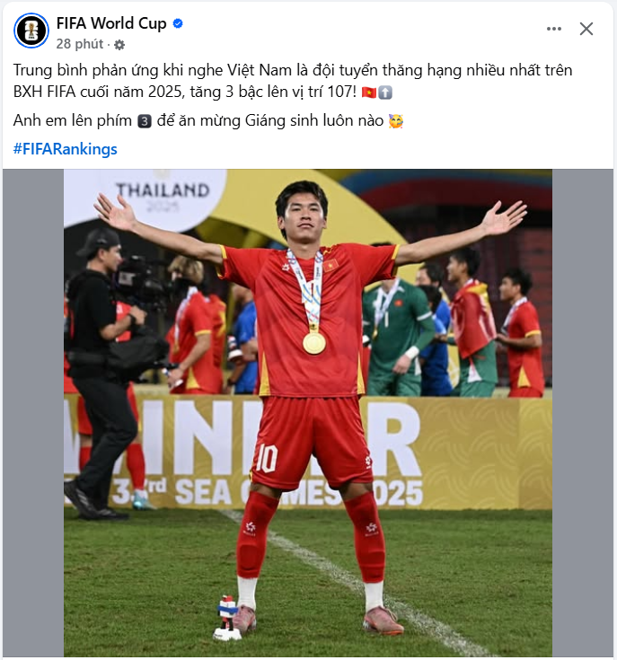 Immediately after the FIFA rankings were updated, the official FIFA fanpageposted an enthusiastic congratulatory message for the Vietnam team. The post read: “The average reaction upon hearing that Vietnam is the team with the biggest rise in the year-end 2025 FIFA rankings, moving up 3 spots to 107th”, accompanied by the Vietnamese flag emoji and an upward arrow. FIFA even urged fans to “Brothers, get your keyboards ready to celebrate Christmas now,” showing excitement about Vietnam football’s impressive progress.