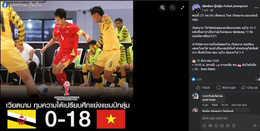 Right after the match, numerous Thai futsal fanpages and news outlets spoke out. The fanpage ฟุตซ่อน ปู้นปู้น-Futsal poonpoon commented: “Tomorrow (December 25) will definitely be intense as Thailand and Vietnam compete for the top spot. Vietnam showed an extremely frightening form, crushing Brunei 18-0 in the opener to lead Group A at the 2025 Southeast Asian U19 Futsal Championship.”