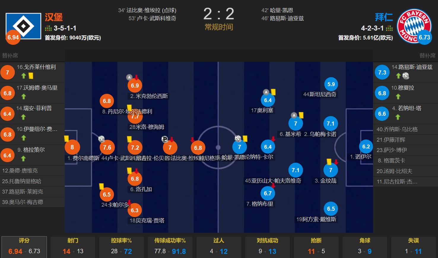 Due to Bayern players’ fatigue from competing on multiple fronts, combined with referees seemingly having a “mission,” the match ended in a 2-2 draw between the northern and southern kings. Fans joked that the northern king has finally forgiven the Bundesliga for its promotion, implying the German Football Association won’t let Hamburg drop back to the 2.Bundesliga. In this match, Bayern had 72% possession away, took 13 shots—one less than Hamburg’s 14—with 7 on target compared to Hamburg’s 4. Bayern’s two rounds without a win and 5 points dropped have little impact on the Bundesliga title race.