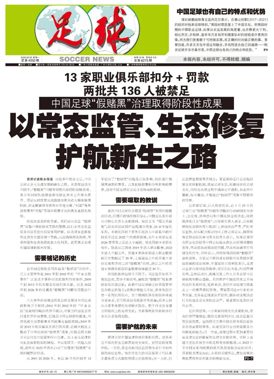 On the regulatory front, it is reassuring that at the January 29 press conference on the special campaign against match-fixing in football, the Ministry of Public Security, the General Administration of Sport, and the Chinese Football Association all pledged to deepen their crackdown: a Public Security official stated that the ministry will continue collaborating with sports authorities to uphold strict law enforcement and maintain high-pressure actions, ensuring thorough implementation; a representative from the General Administration of Sport’s competitive sports department said they will cooperate with the Public Security Ministry to guide the CFA in resolutely investigating corruption cases, punishing violations, and correcting misconduct undermining sportsmanship. They also vowed to consolidate and expand governance achievements to provide stronger political support for football’s revitalization. Chinese Football Association Chairman Song Kai emphasized that football professionals must deeply learn from these lessons, remain vigilant, and strictly adhere to legal and ethical standards to jointly protect the hard-earned positive development environment of Chinese football.