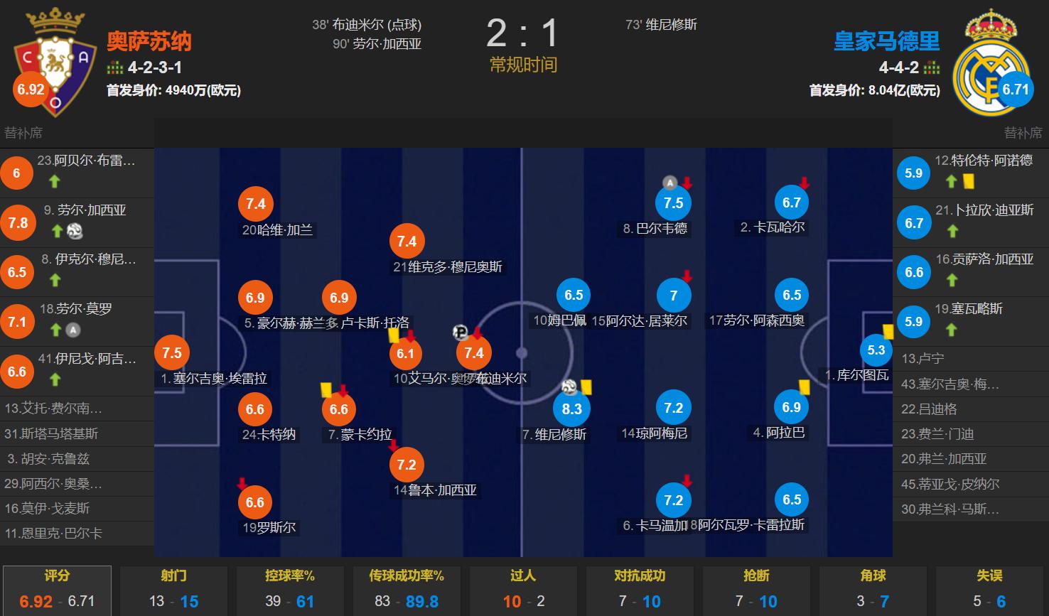 Osasuna lined up in a 4-2-3-1 formation against Real Madrid, with a starting lineup valued at 49.4 million euros;Avelar deployed a 4-4-2 formation, pairing Vinícius and Mbappé upfront, with Camavinga, Tchouaméni, Guiller, and Valverde forming the midfield quartet, and Carreras, Alaba, Raúl García, and Carvajal making up the back four. The starting lineup’s value was 804 million euros..