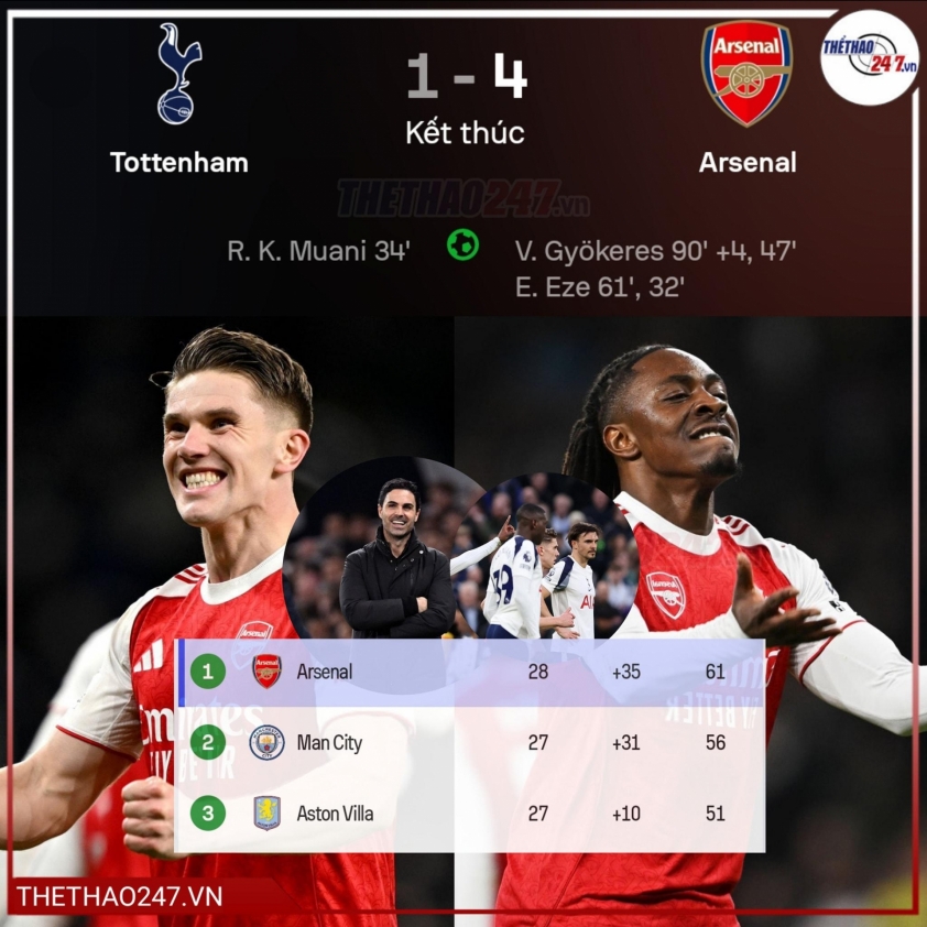 In the second half, Viktor Gyokeres restored Arsenal’s lead, then Eze completed his brace and Gyokeres sealed the victory with a stoppage-time goal.