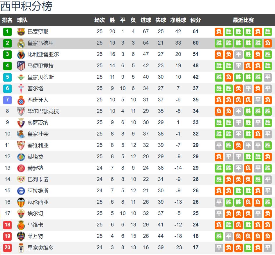 After 25 rounds, Real Madrid stands second with 19 wins, 3 draws, and 3 losses, totaling 60 points, while Barcelona leads with 20 wins, 1 draw, and 4 losses, totaling 61 points. The two teams are separated by just one point. Barcelona lost the top spot after their last La Liga defeat, but with Real Madrid’s loss this round, Barcelona has regained first place. Considering the current form of both teams, Barcelona has regained the edge in the title race. Both teams have defensive weaknesses, but Barcelona scores significantly more goals, making them the favorite to win La Liga this season.