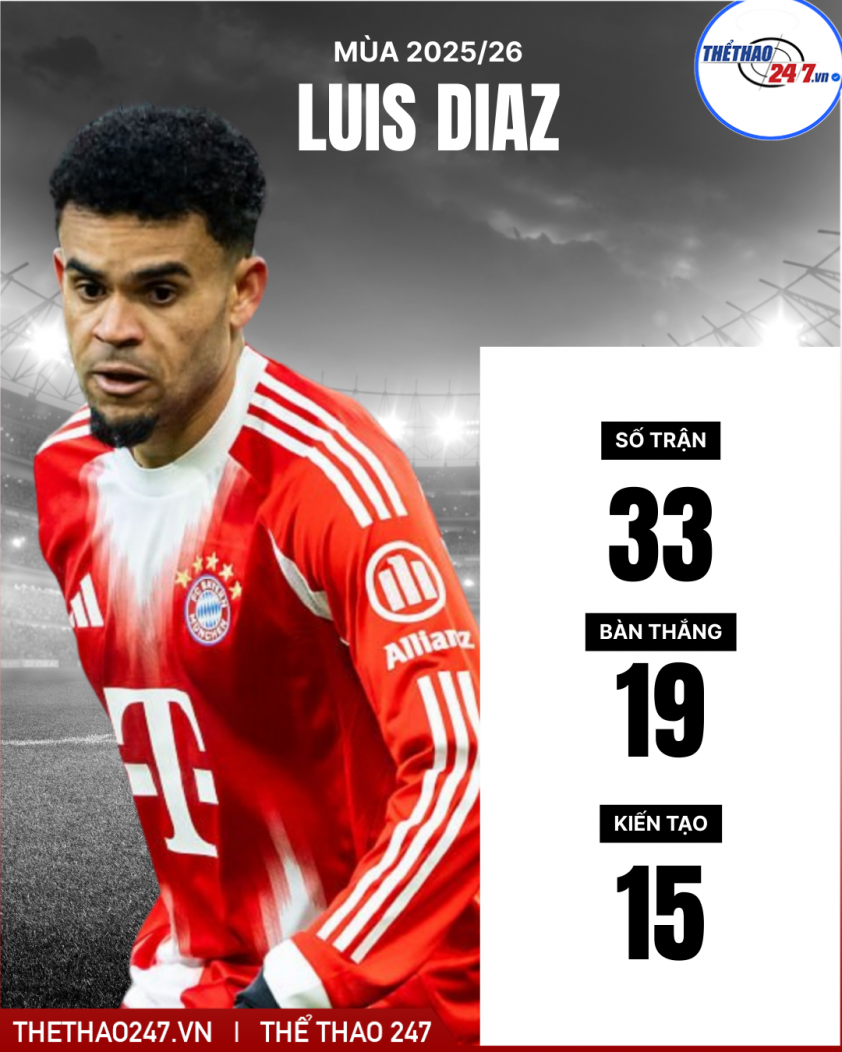 After winning the title with Liverpool in the Premier League during his first season under Arne Slot, Luis Diaz moved to the reigning Bundesliga champions for a fee of £65.5 million. He adapted quickly, scoring 19 goals and providing 15 assists in 33 matches this season. Overall, Diaz has contributed to 34 goals in 33 games for Bayern.