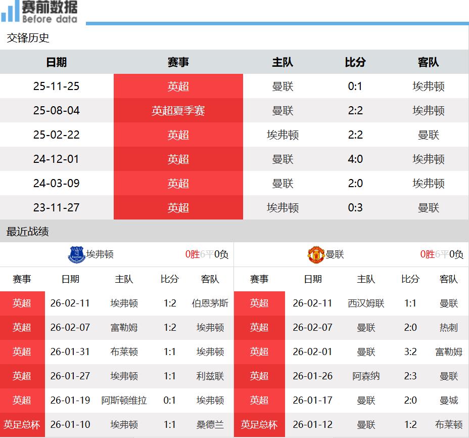 First:Team SituationsAfter 26 Premier League rounds, Everton has 10 wins, 7 draws, and 9 losses, accumulating 37 points and ranking ninth, while Manchester United has 12 wins, 9 draws, and 5 losses, with 45 points, ranking fifth. In the last round, Everton lost 1-2 at home to Bournemouth, ending a five-match unbeaten streak; Manchester United drew 1-1 away against West Ham, halting a four-game winning streak. Both teams are competing in a single competition line, so their fitness levels are sufficient.