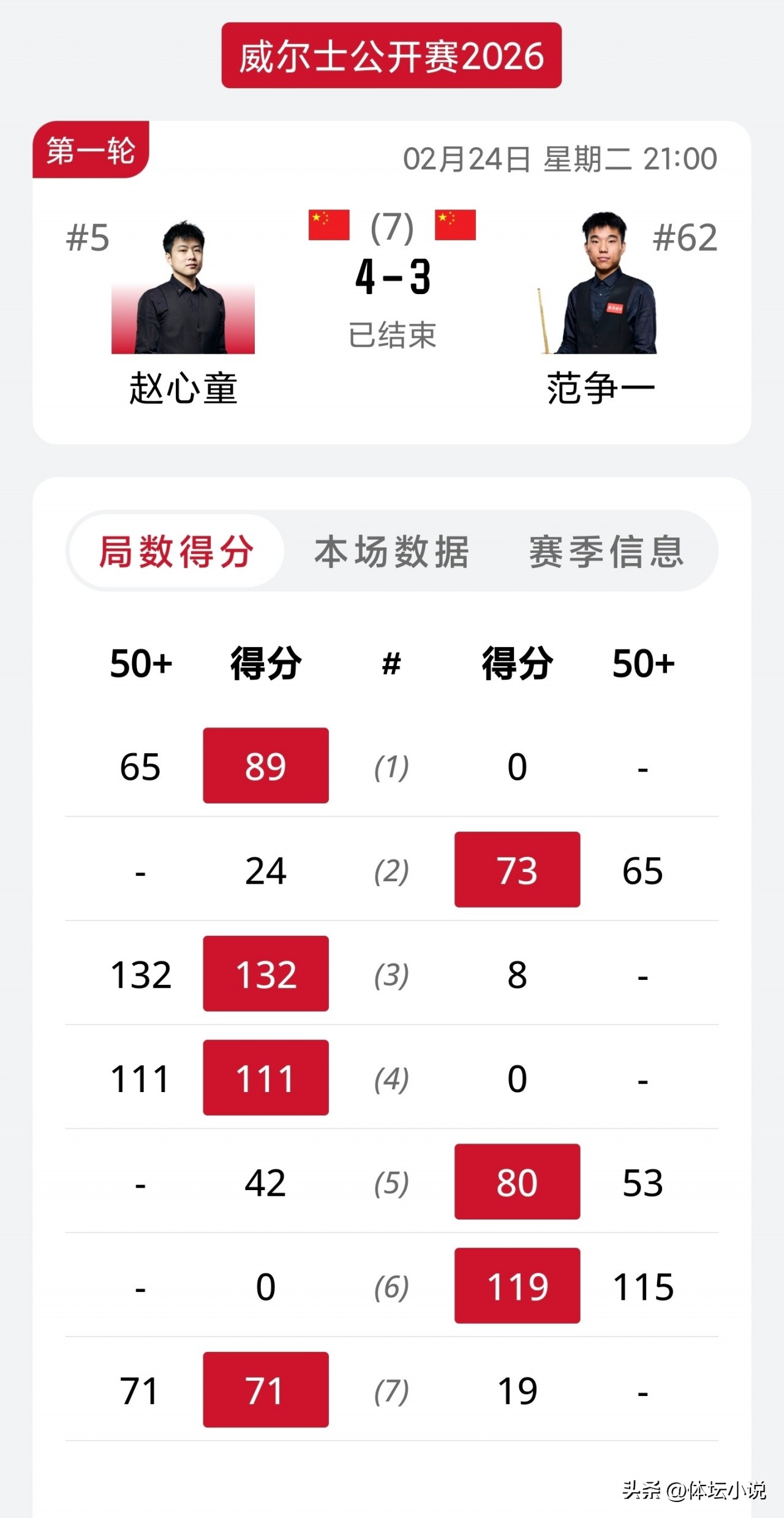 In the matchup between Zhao Xintong and Fan Zhengyi, an intense derby battle unfolded. Zhao, competing back-to-back events, has become the standout player, with stamina being his biggest challenge. The two delivered a high-level contest: they split the first two frames 1-1 with winning breaks. Zhao then hit two successive centuries to reach a 3-1 match point. Fan held his nerve, winning two frames in a row to tie 3-3 and push the match to a decider. In the final frame, Zhao showed his killer instinct with a match-winning break, eventually defeating Fan 4-3 to safely advance to the last 32. Fan played very well, but Zhao was simply more fierce!