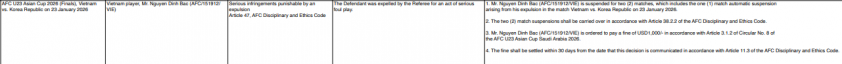 Notably, the AFC also clarified the disciplinary carry-over mechanism: if a player is ineligible to participate in the current tournament, the suspension will be applied to the next official match at the national team level according to the AFC Disciplinary and Ethics Committee’s regulations. In Đình Bắc’s case, this is highly likely since he is overage for the next AFC U23 Championship edition. In other words, the suspension will probably be enforced during matches at the senior national team level.
