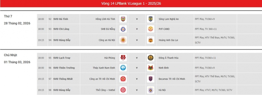 The other three matches will all kick off on March 1. At Thiên Trường Stadium, the defending champions will host their "brother" team Ninh Bình amid tough circumstances: fighting to avoid relegation. After 13 rounds, the Nam Định team has only 12 points and sits third from the bottom. Meanwhile, Ninh Bình is determined to reclaim the top spot from CAHN. Notably, the match will be even more thrilling as Ninh Bình’s coach Albadalejo returns after a suspension, and Nam Định welcomes the incredible comeback of coach Vũ Hồng Việt after a 3-month absence.