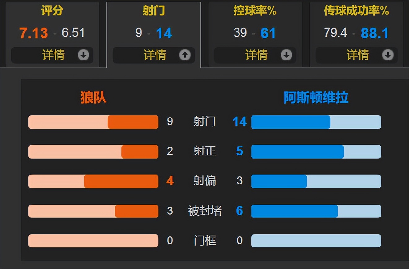 Throughout the match,Wolves had 39% possession, with a total of 9 shots, 2 of which were on target. Aston Villa had 14 shots, with 5 on target. Wolves won due to higher efficiency, scoring 2 goals from just 2 shots on target.