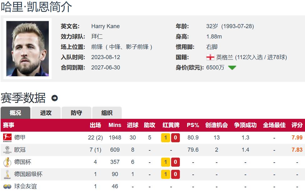 Kane has already netted an astonishing 45 goals this season (excluding the Club World Cup), comprising 30 goals in 24 Bundesliga matches, 8 in 8 Champions League games, 6 in 4 DFB-Pokal appearances, and 1 in the German Super Cup. According to statistics, Kane is the first English player to score 45 goals in a single season since Dixie Dean of Everton, who scored 46 in the 1931-32 season. With a significant portion of the season still remaining, after breaking this 94-year-old record, Kane is poised to set even more records.