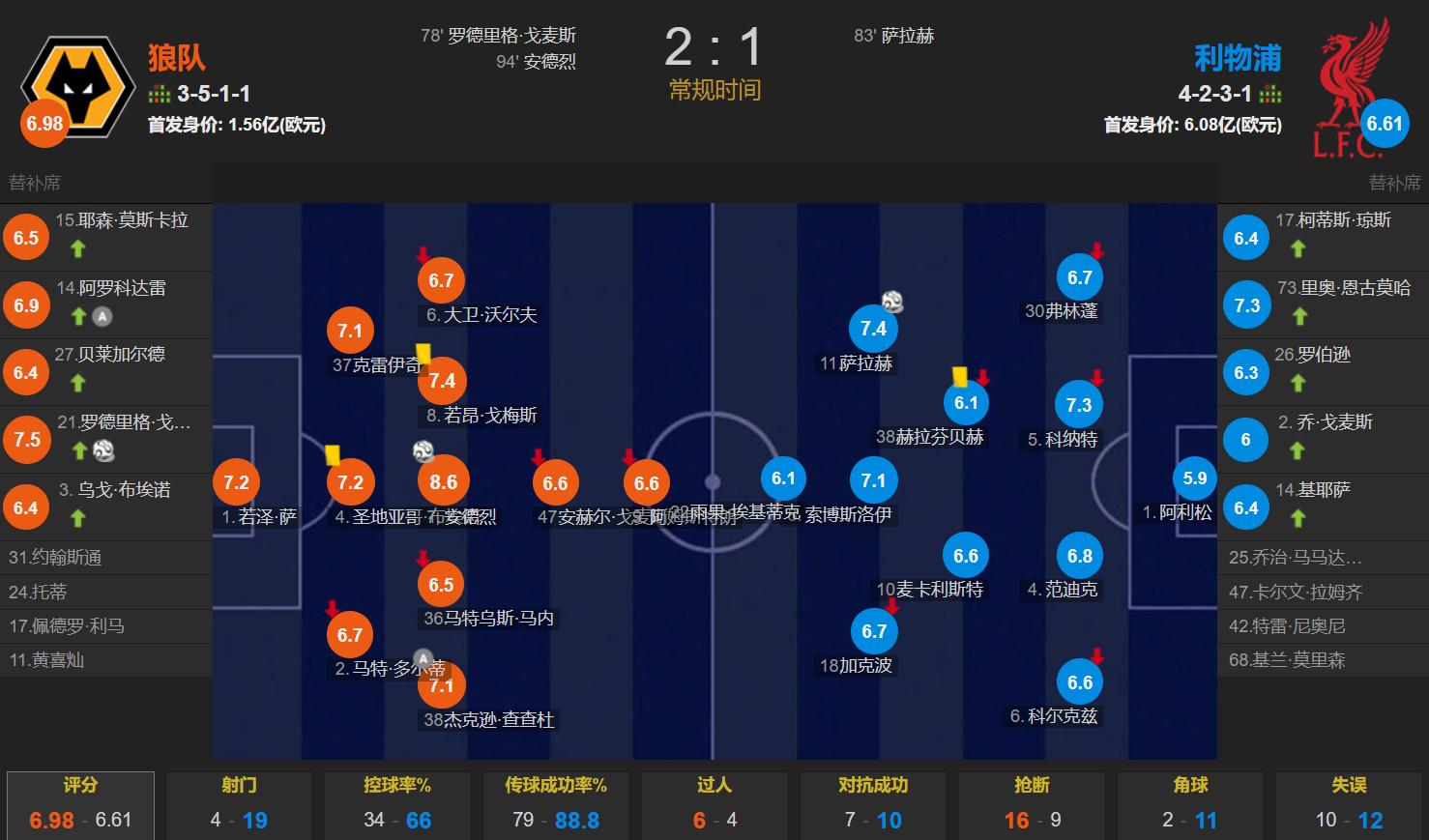 The root cause of Liverpool's defeat was their blunt attack. Striker Ekitike was anonymous, left-winger Gakpo performed like a Wolves right-back and bizarrely missed an open goal. Right-winger Salah scored one, but Liverpool's attacking unit overall was ineffective, dominating possession without converting chances, ultimately conceding a late winner.