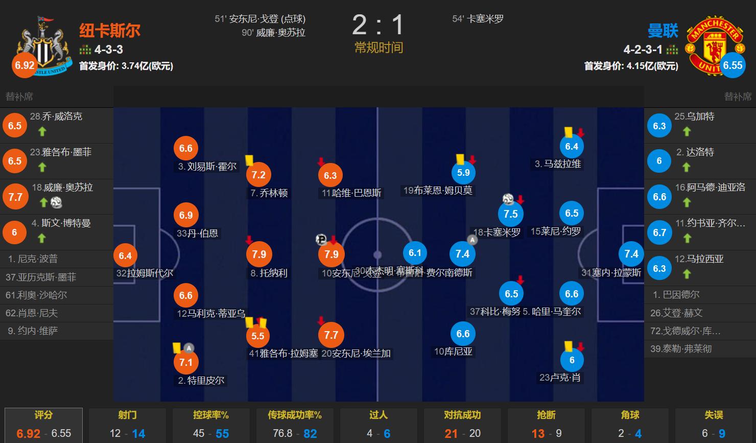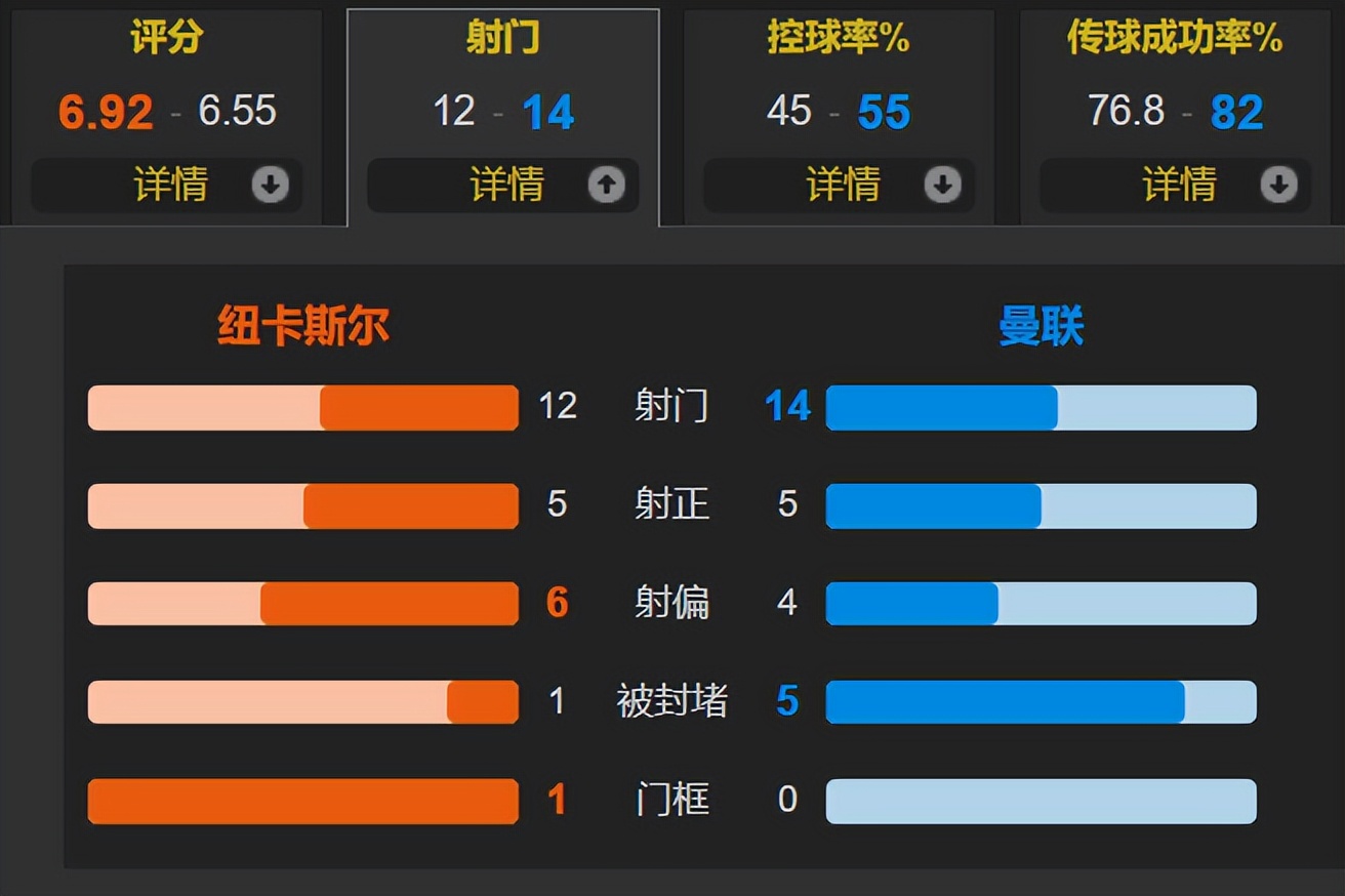 Looking at the match statistics, Manchester United showed no advantage despite having an extra player for over half the game. Throughout the match,Newcastle had 45% possession, with a total of 12 shots, two fewer than Manchester United, but both teams managed 5 shots on target.