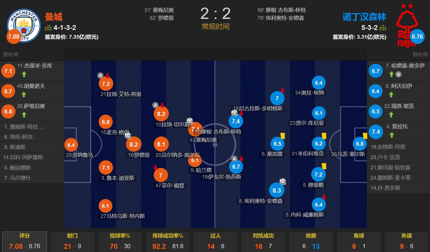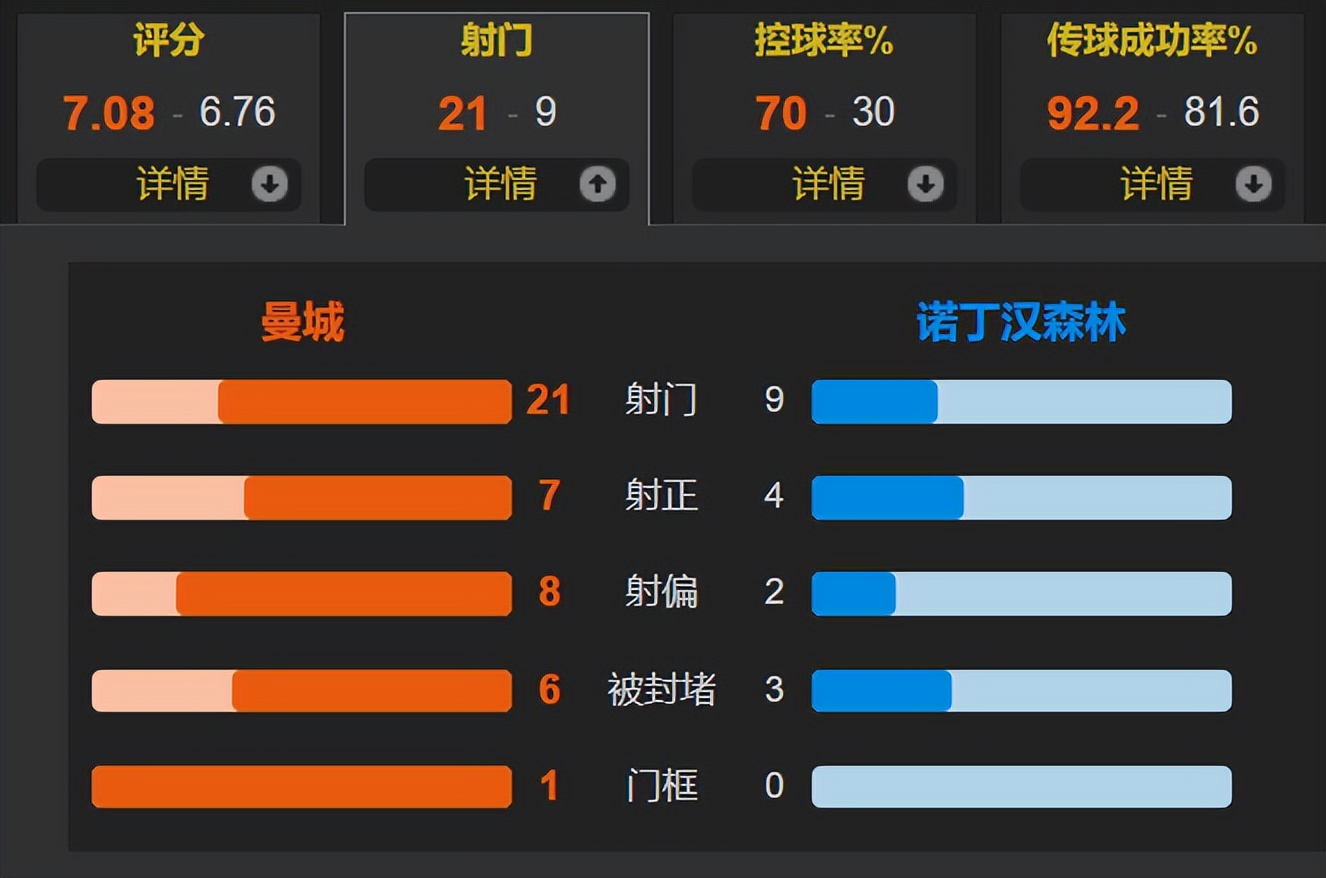 Throughout the match,Manchester City had 70% possession, unleashing 21 shots with only 7 on target; Nottingham Forest had 9 shots, with 4 on target.