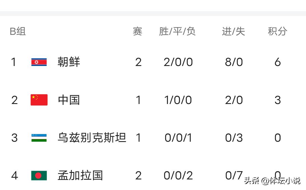 Group B's second round commenced today. The mysterious North Korean team displayed dominant form, winning their first two matches 3-0 against Uzbekistan and 5-0 against Bangladesh, truly on a rampage. As a result, North Korea not only sits top of the group with two wins but has also secured a quarterfinal spot early. The Chinese women's team has played only one match so far, a 2-0 shutout of Bangladesh, temporarily placing second in the group. Today they will face Uzbekistan. Our goal is to strive for victory to secure qualification for the quarterfinals one round early. The opponent's strength is not formidable, so securing a win should not be a major issue. The final round will present a challenge as they face North Korea for the group top spot, where hopes for victory are slim!