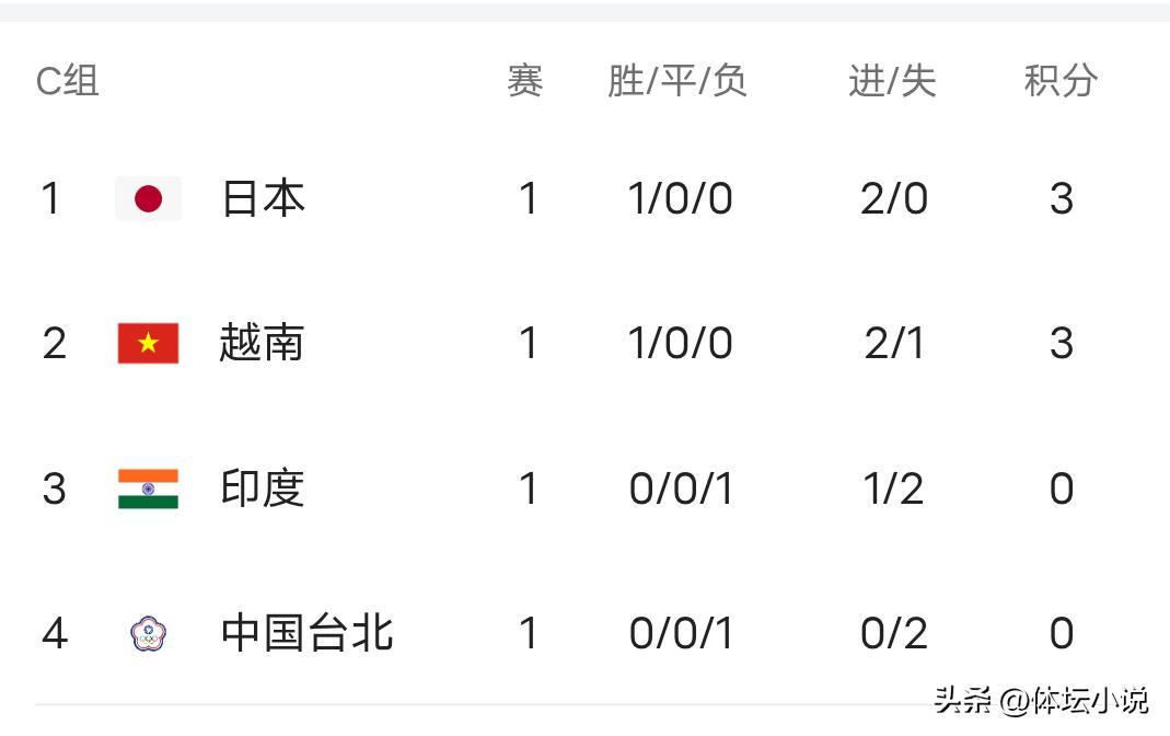 In Group C, only the first round has been played. Tournament favorites Japan defeated Chinese Taipei 2-0, while Vietnam beat India, the world's most populous nation, 2-1. Thus, Japan currently leads the group, with Vietnam in second. The second round of matches for this group will begin tomorrow!