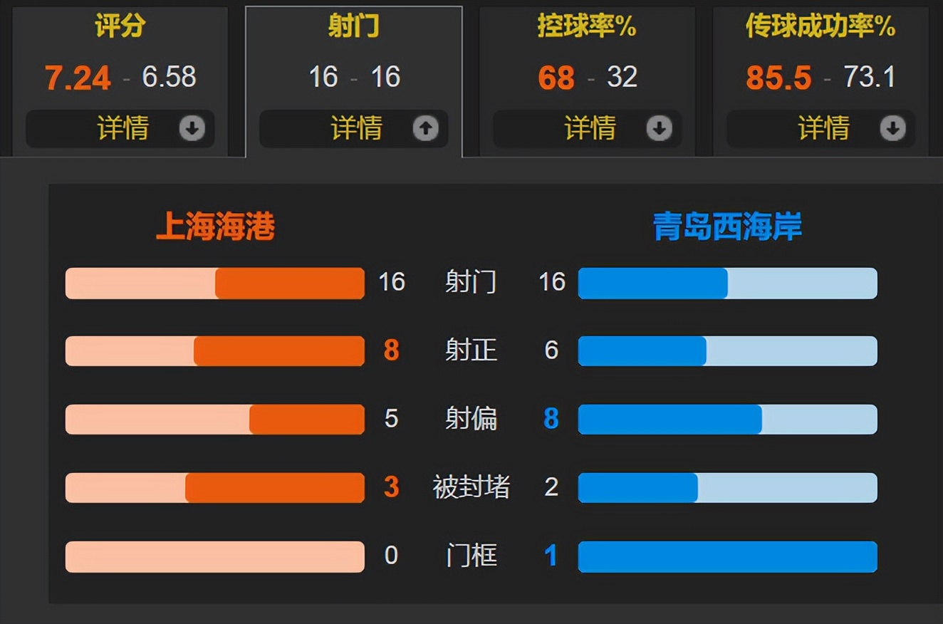 In CSL matches, the difference between strong and weak teams often hinges on shooting accuracy.Shanghai Port had a 68% possession rate, but both teams had 16 shots, with Shanghai Port registering 8 on target and Qingdao West Coast 6 on target.The final score was 4-1, proving Wu Lei is the CSL's top "sharp shooter".