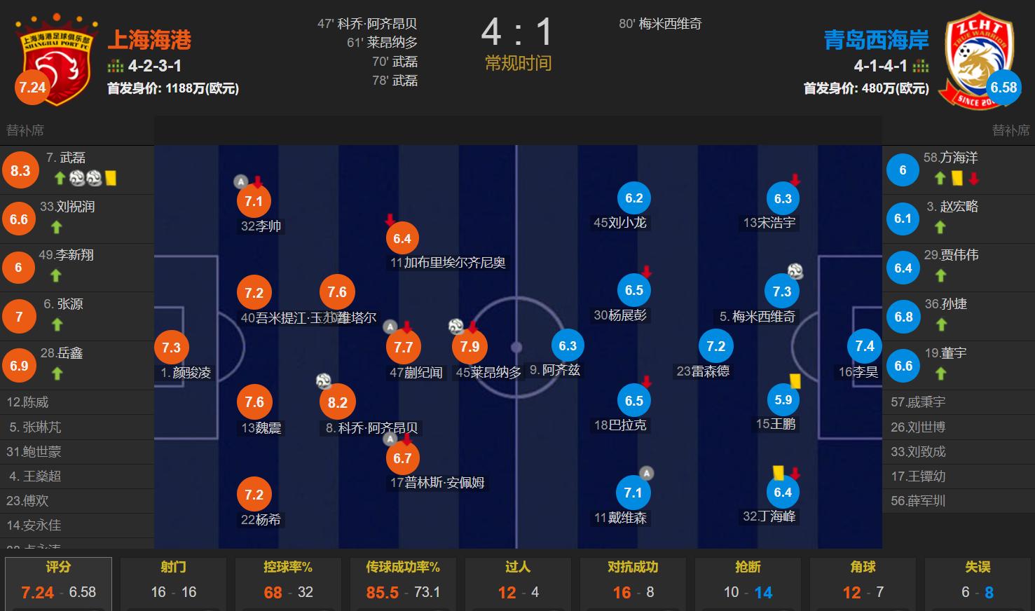 In the Shanghai Port vs Qingdao West Coast match, Muscat deployed a 4231 formation with a starting lineup valued at 11.88 million euros, Wu Lei, recovered from injury this season, remained on the bench; Zheng Zhi used a 4141 formation with a starting lineup worth 4.8 million euros.