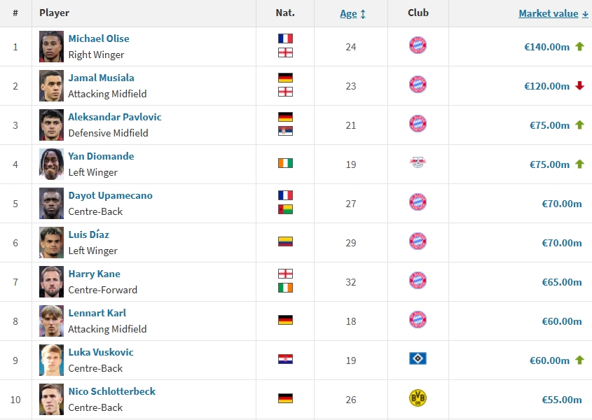 Transfermarkt updated Bundesliga player values on March 20th. The only two "100 million euro" players in the Bundesliga, Olise and Musiala, saw one rise and one fall: Olise increased by 10 million euros, Musiala decreased by 10 million euros. Previously tied for first in the Bundesliga, they now have a 20 million euro gap. Leipzig wingerDiomandesurged by 30 million euros to joint third. Spurs loan defenderVuškovićsurged by 20 million euros to joint eighth.