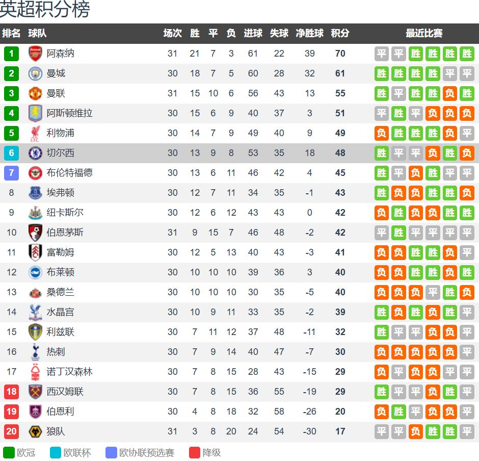 First:Team status! After 30 rounds of Premier League matches, Everton has 12 wins, 7 draws, and 11 losses, accumulating 43 points and ranking eighth, trailing the European qualification zone by only 3 points; Chelsea has 13 wins, 9 draws, and 8 losses, accumulating 48 points and ranking sixth, trailing the Champions League qualification zone by 1 point. In the last Premier League round, Everton lost 0-2 away to Arsenal, ending their two consecutive league wins; Chelsea lost 0-1 at home to Newcastle, with only one win in the last five rounds, and suffered a 0-3 defeat at home to Paris in the midweek Champions League, resulting in elimination.