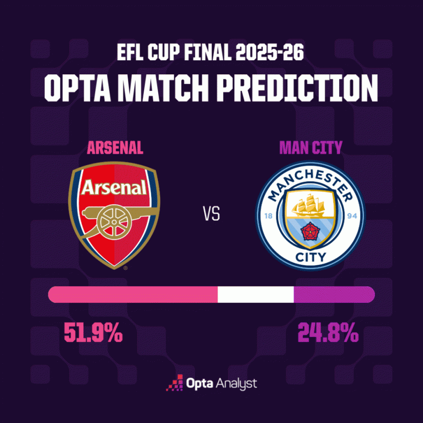 Opta's supercomputer has delivered predictions and significant statistics concerning the clash between Arsenal and Man City in the 2025/26 Carabao Cup final.