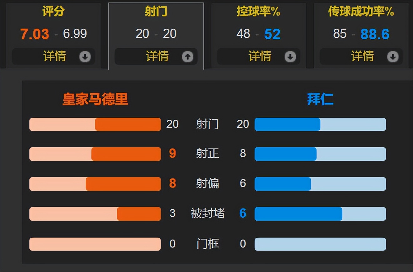 The main reason for Real Madrid's home loss was their forward line. Vinicius had 7 shots, the highest in the match, but failed to score; Mbappe had 6 shots, ranking second, and scored one goal. Without a central striker, Real Madrid's pairing of two left-wingers as dual strikers made it difficult to achieve a synergistic effect greater than the sum of their parts. Bayern's most stable points were Kane's output and Olise's dribbling and "setup" play.