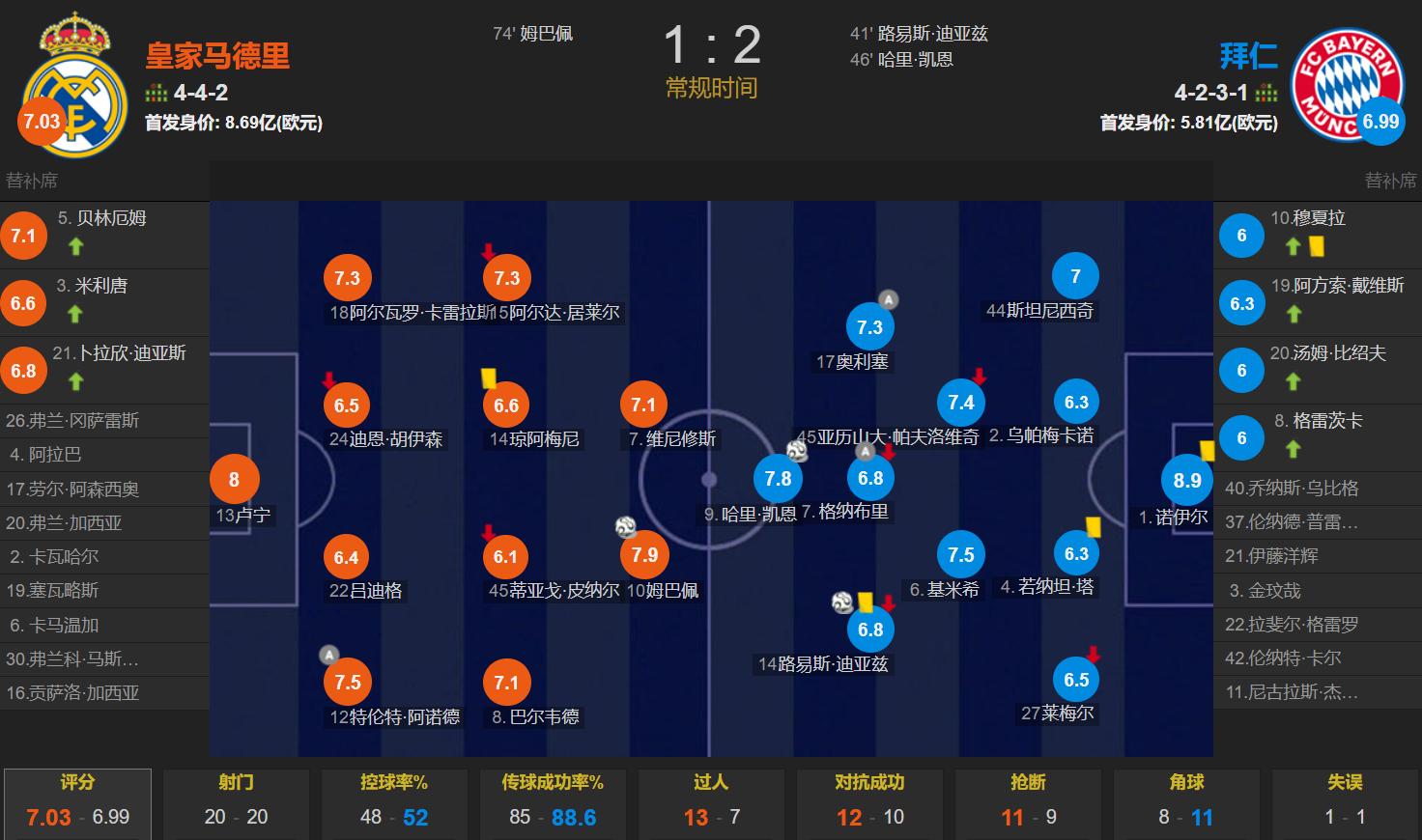 The match was evenly contested, with possession rates very close.Bayern had a slight advantage with 52% possession. Both sides had 20 shots, with Real Madrid registering 9 shots on target, one more than Bayern's 8.However, Bayern was more efficient. The match was filled with Premier League elements, as former Premier League players were involved in all three goals. The first goal was scored by former Liverpool forward Diaz; although he scored, he lost possession too frequently, and Diaz might be the weakest link in Bayern's attacking trio, also lacking in finishing. The second goal came from a Premier League connection: Olise (Crystal Palace) assisted Kane (Tottenham) to score. The third goal was assisted by Liverpool's "prince" Arnold for Mbappe's goal.