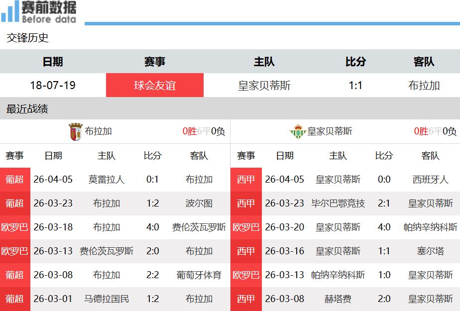 First:The situation of both teams! Braga currently ranks fourth in the Portuguese league, with a total squad value of €155 million; Betis currently ranks fifth in La Liga, with a total squad value of €249 million. In their last match, Braga narrowly won 1-0 away against Moreirense, having already missed the chance to secure a Europa League spot for next season via league standings; Betis drew 0-0 at home against Espanyol.