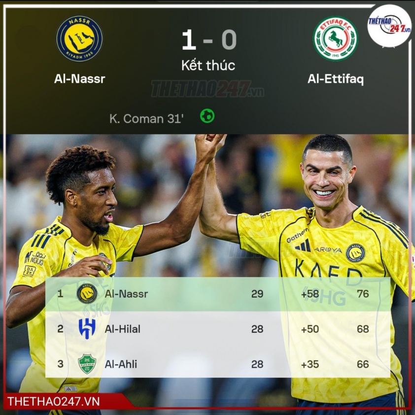 (Football result) - Kingsley Coman's goal in the 31st minute was sufficient for Al-Nassr to beat Al-Ettifaq 1-0 in the Saudi Pro League fixture held early morning April 16.
