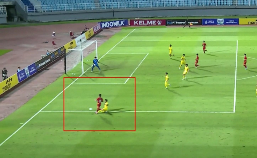 Tri Dung attempted a breakthrough and crossed the ball inside, but the play was unsuccessful as the Malaysia U17 defender timely intercepted.