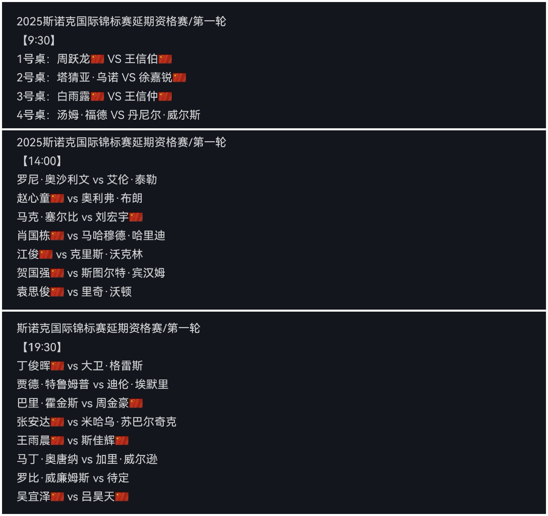 CCTV-5+ channel will provide live coverage tomorrow at 2:00 PM, most likely broadcasting the match between Zhao Xintong and Oliver Brown. Other matches will be streamed on Huya and Migu Video platforms.