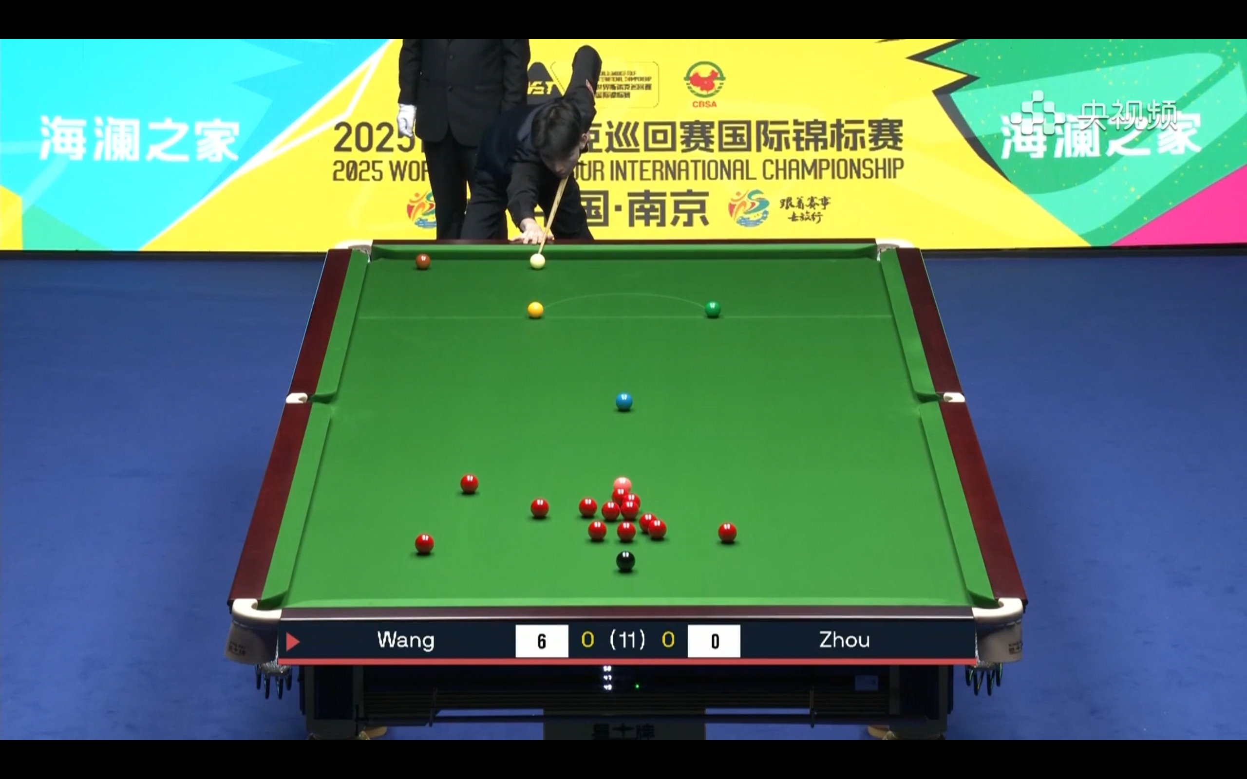 This match is played in a best-of-11 frames format, and the players are currently competing in the first frame, with the score at 0-6 in favor of Wang Xinbo.