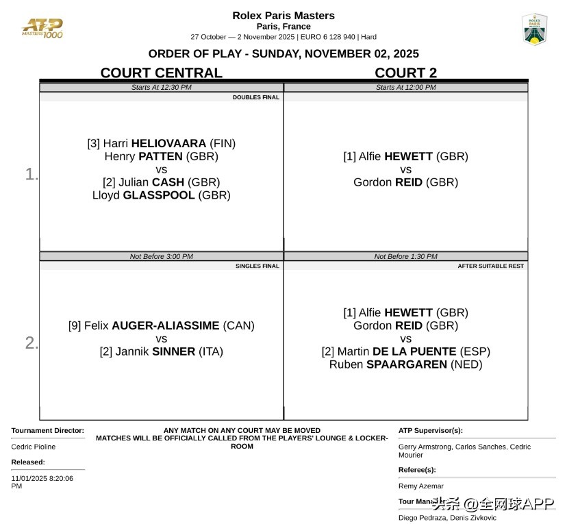 Tonight at 19:30 Beijing time, the Paris Masters final day will kick off with the men’s doubles final, where second seeds Kas and Graspur face third seeds Heliövaara and Paaten. No earlier than 22:00, Sinner and Alcaraz will contest the men’s singles title. Their head-to-head stands tied at 2-2. If Sinner wins, he will reclaim the world No. 1 ranking; if Alcaraz triumphs, he will secure the final spot in the year-end championships.