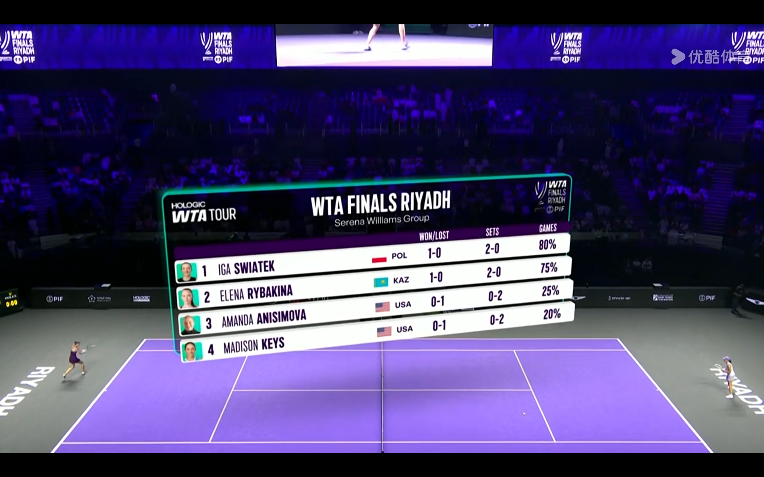 Youku Sports Channel is offering free live streaming of the WTA Year-End Finals tennis match between Swiatek and Rybakina.