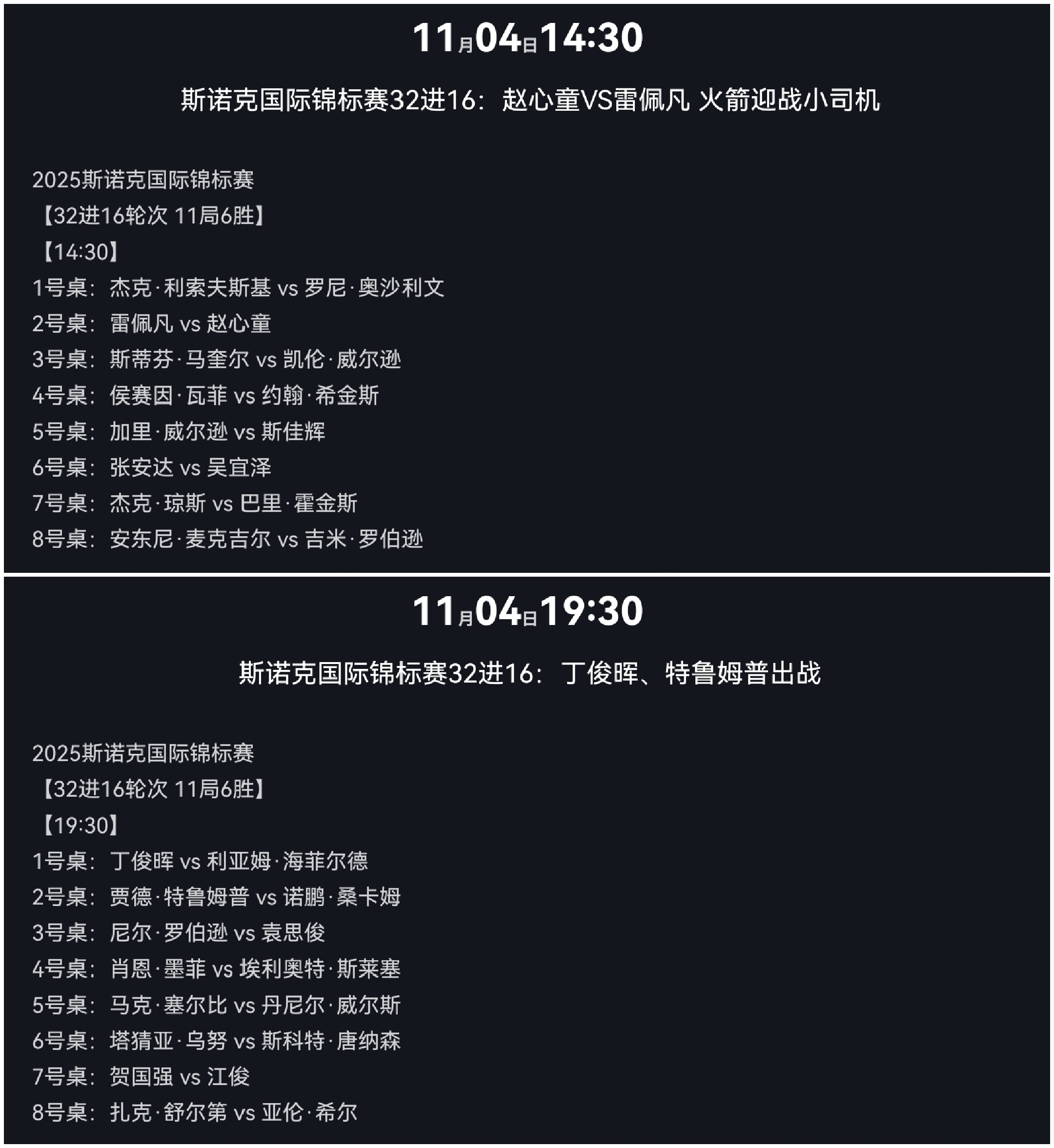 Today marks the round of 32 to 16 matches, played in a best-of-11 frames format. The detailed schedule is shown in the image below.