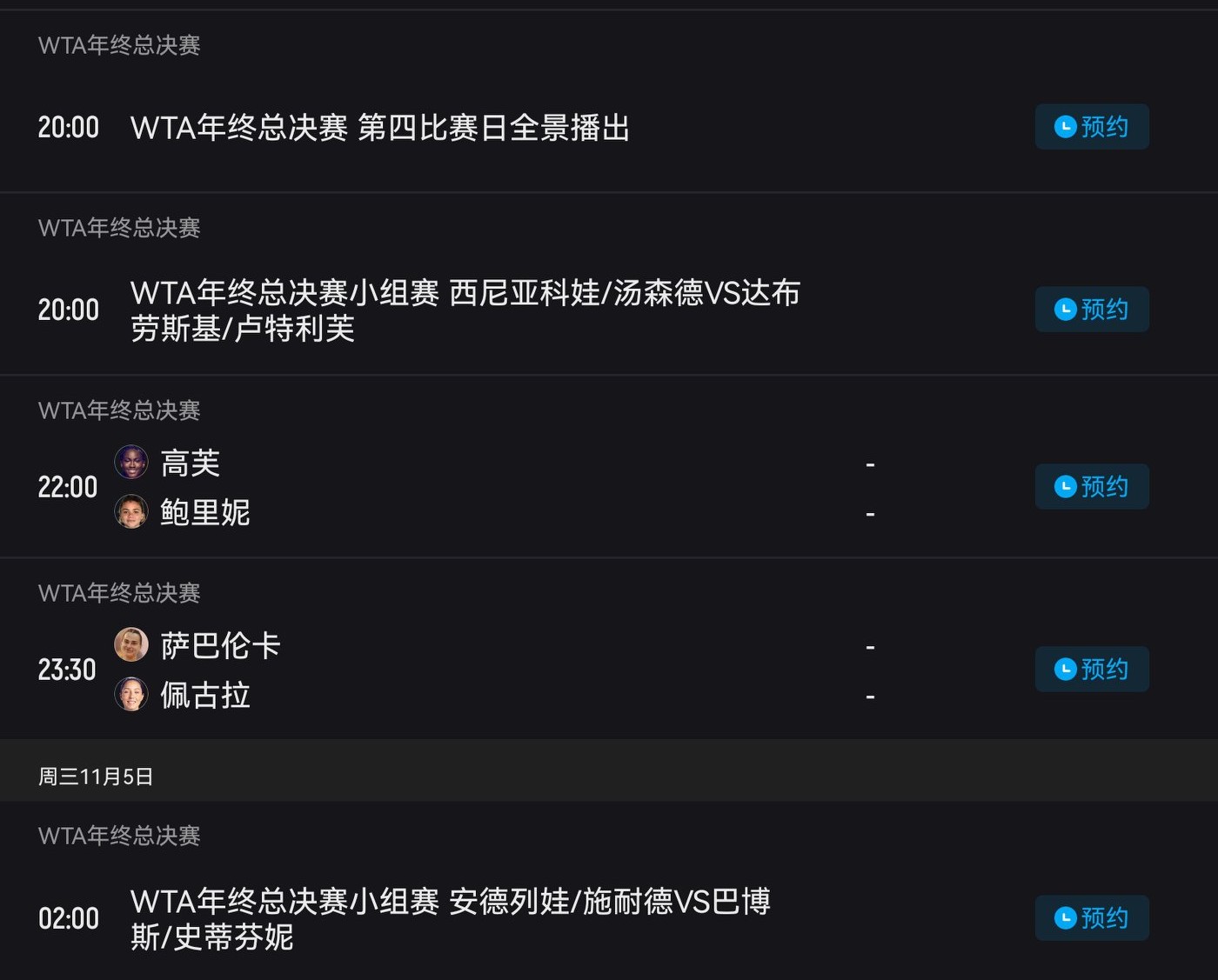 The 2025 WTA Year-End Finals schedule for today (November 4) includes Sabalenka, Pegula, Gauff, and Paolini competing, broadcast live on Youku.
