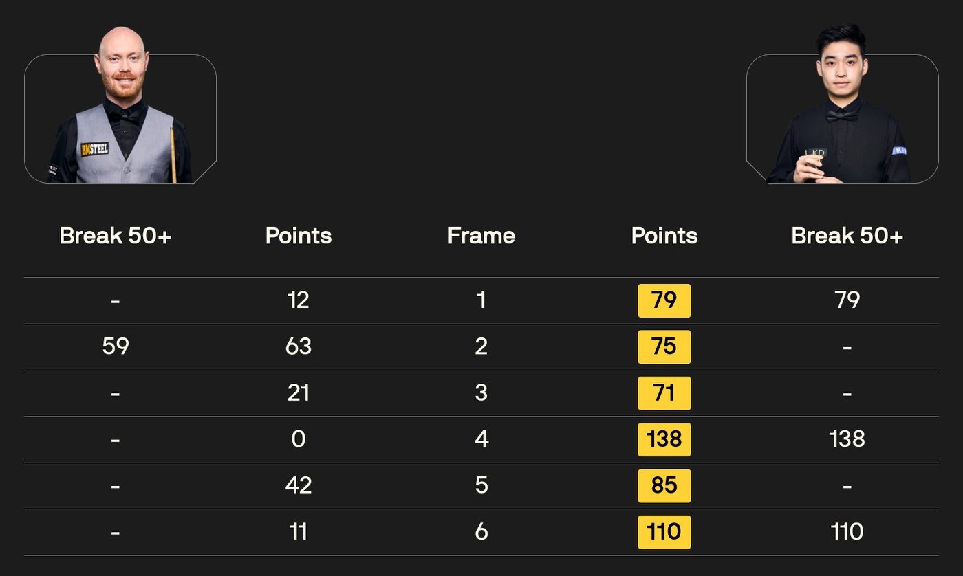 The match was dominated by one side, as Si Jiahui blanked Gary Wilson 6-0. His break scores included 79, 75, 71, 138, 85, and 110.