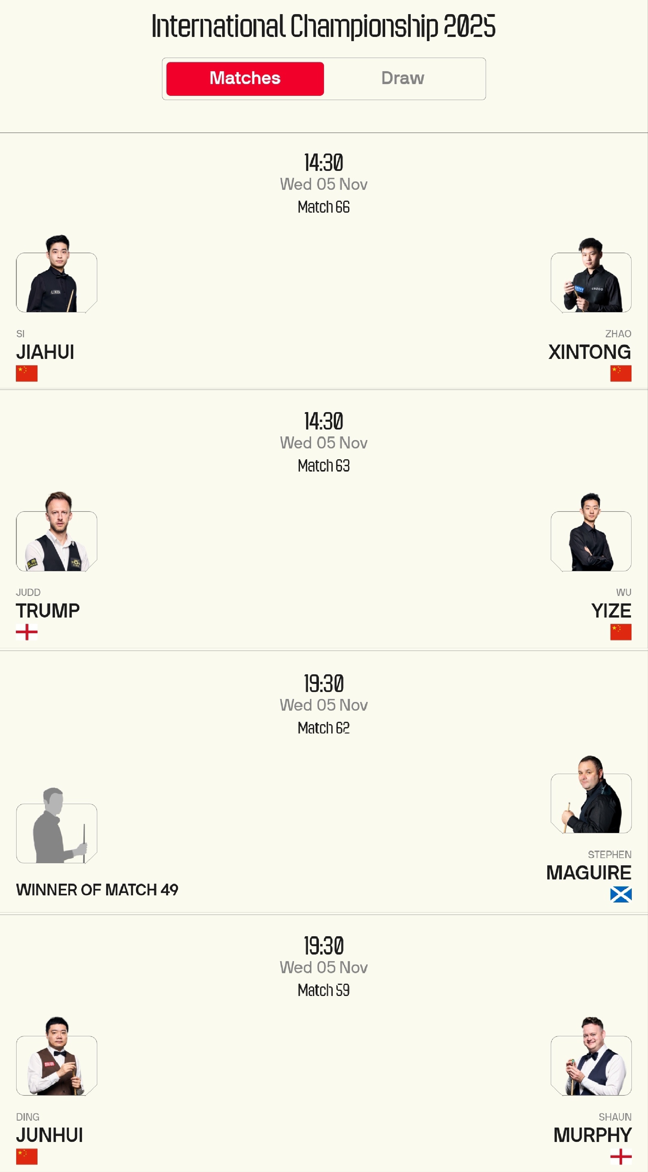 Tomorrow is the round of 16 to quarterfinals stage, still following the best-of-11 frames, first to 6 wins format. Five national players will compete; details are shown in the image below.