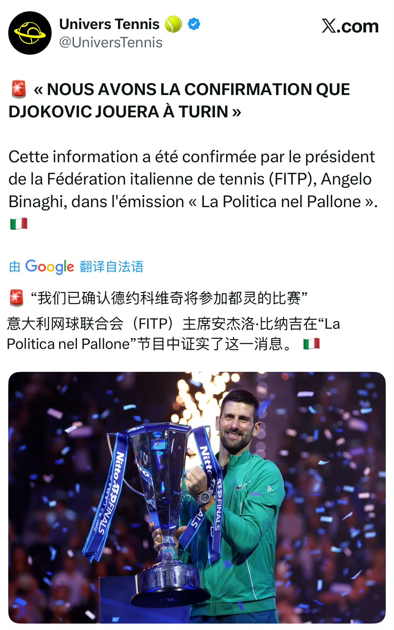 However, off-court news has added some uncertainty to Djokovic’s upcoming schedule. Before the Athens event, Italian Tennis Federation President Binaghi confirmed in an interview that Djokovic would return to Turin this year to compete in the year-end finals.