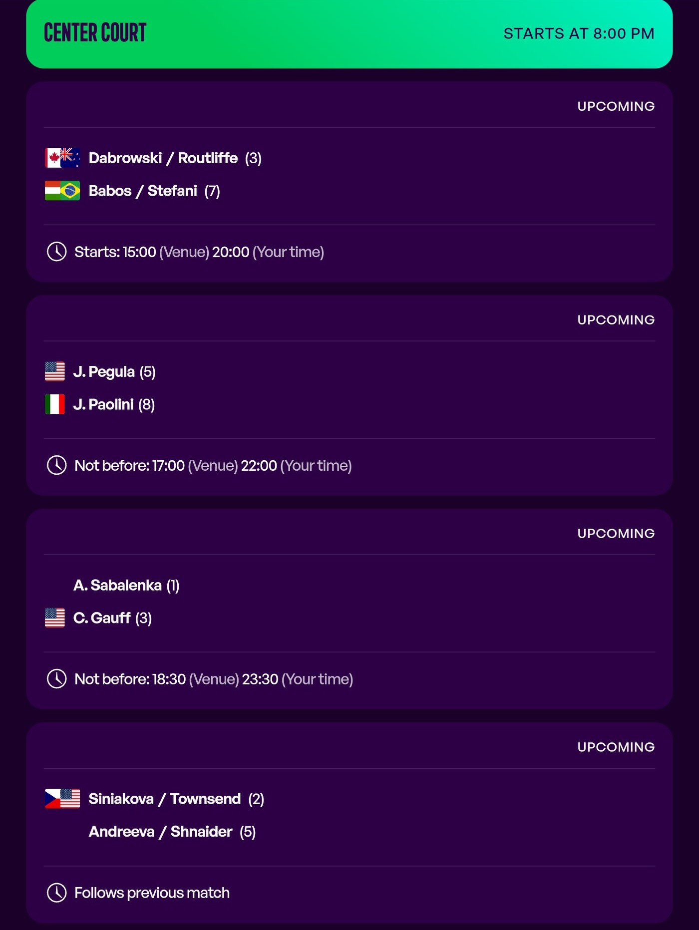 At 10 PM tonight, Pegula will face Paolini.