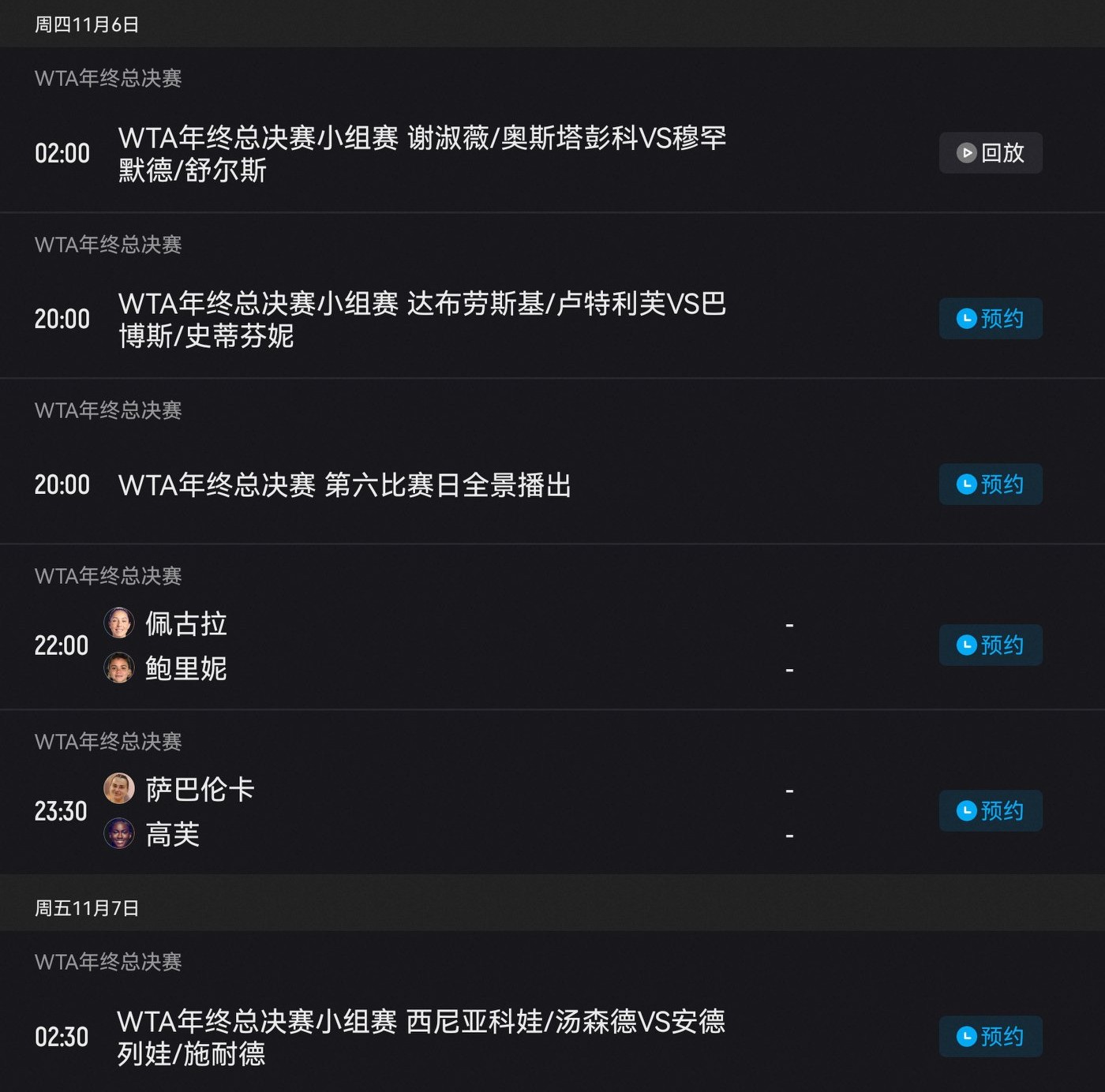 The WTA Finals schedule for today (2025.11.6) includes Sabalenka, Gauff, and Pegula competing, with free streaming on Youku.