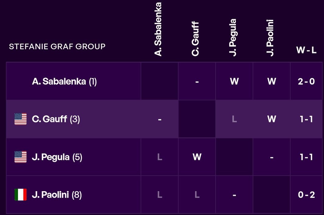Gauff is currently second in the group and is actually the most dangerous contender. To qualify, she must beat Sabalenka, which is very difficult. Even if she wins, advancement is not guaranteed.