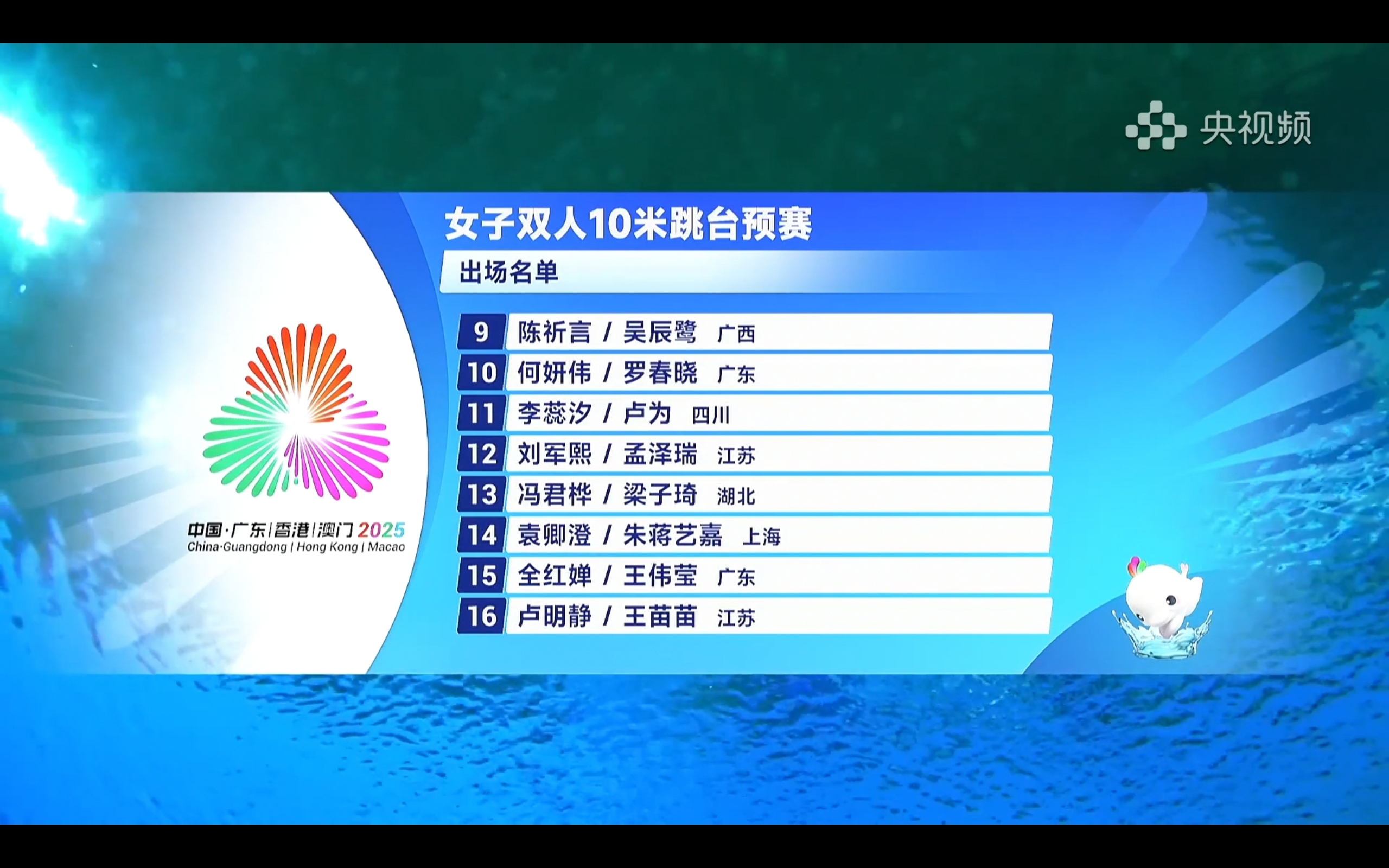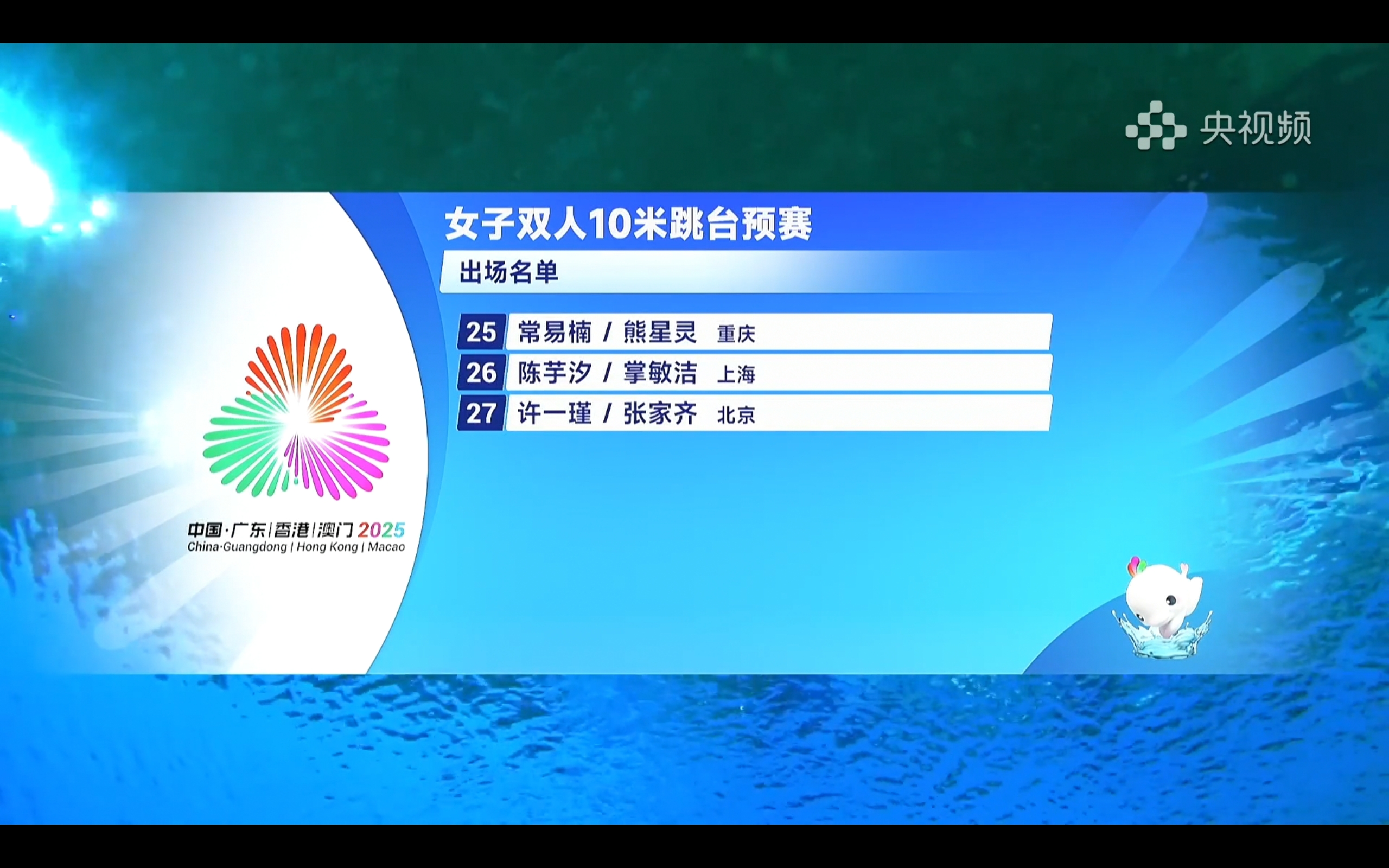 Yangshipin is broadcasting the women's synchronized 10-meter platform diving preliminaries at the National Games for free, featuring Quan Hongchan and Chen Yuxi.