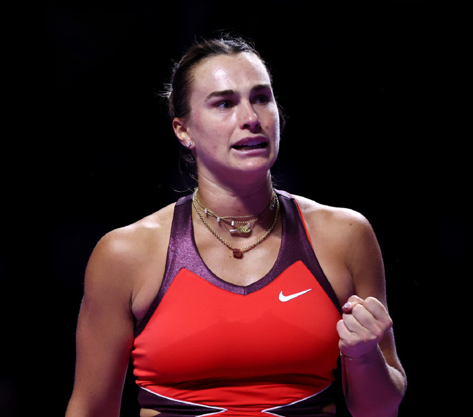 Let's start by looking at the Riyadh WTA Year-End Finals. Early this morning Beijing time, the final round of the singles Graf group wrapped up, confirming all four semifinalists. The top seed and world number one Sabalenka defeated the third seed, American Gauff, 7-6(5), 6-2, advancing to the semifinals with an undefeated 3-0 record. With this win, the Belarusian player became the second athlete, after the Russian beauty Sharapova, to reach the semifinals in four consecutive Year-End Finals, matching the legendary predecessor's record.