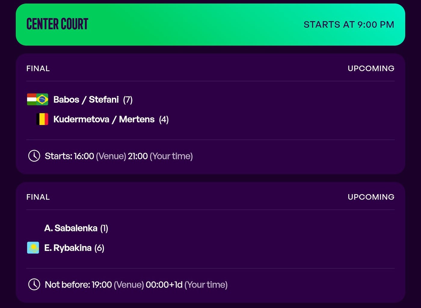At 9 PM tonight,the women's doubles final will be Barbora Stephens versus Kudermetova and Mertens.