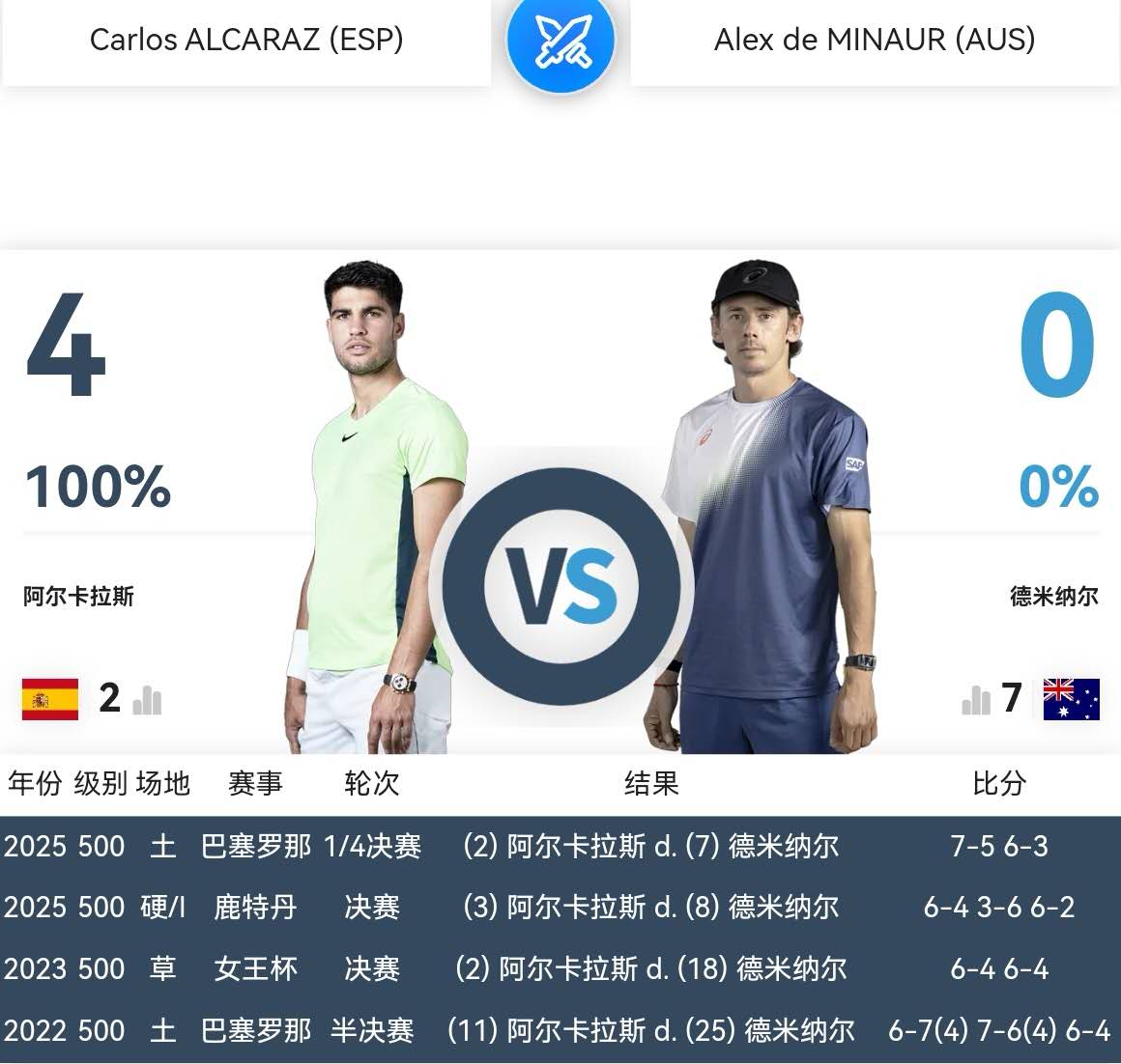 This season, they faced each other twice. Alcaraz won 2-1 in the ATP 500 Rotterdam final, earning his first indoor hard court title. In the ATP 500 Barcelona quarterfinals, Alcaraz defeated De Minaur in straight sets, improving their head-to-head to 4-0. Now at the Year-End Finals group stage, with Alcaraz attending for the third time and De Minaur for the second, Alcaraz should be able to dominate without giving his opponent a chance.